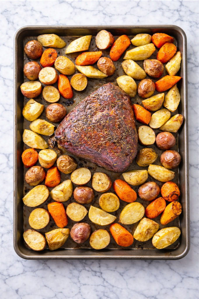 Sliced corned beef roasts with baby potatoes and carrots until the edges crisp slightly and the vegetables soften.