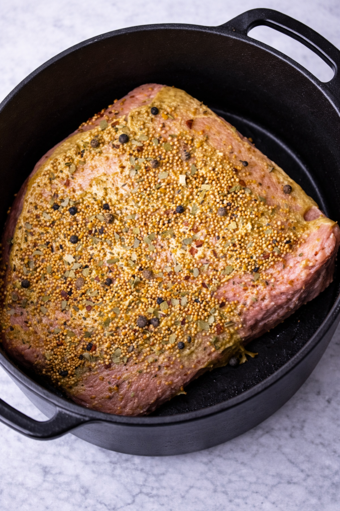 Heat the oven to 325°F. Rinse the brisket briefly under cool water to remove excess brine, then pat it fully dry.