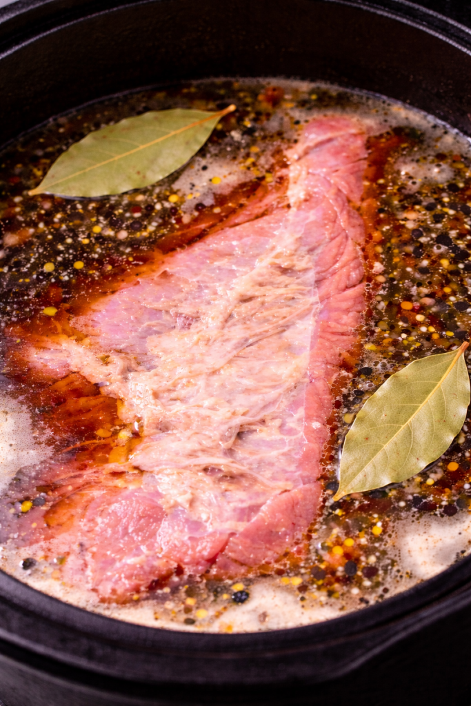 Corned Beef and Cabbage with Guinness served on plate with broth