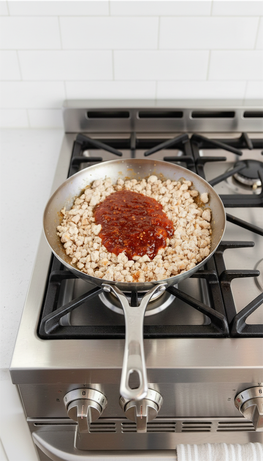 Pour the orange garlic sauce into the skillet and stir to coat the chicken completely. Reduce the heat to medium and let it simmer for about 4 to 5 minutes. The sauce will thicken slightly and cling to the crumbles, creating that glossy finish.