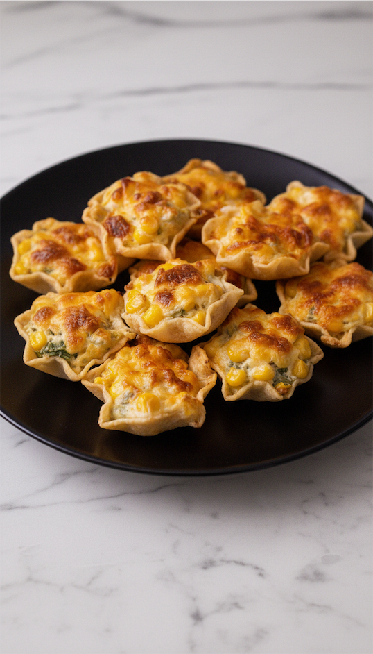 These Iowa cheesy corn-stuffed tortilla bites are crisp tortilla scoops filled with a creamy mixture of cheese, sweet corn, and mild green chiles, finished with a golden parmesan topping.